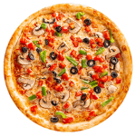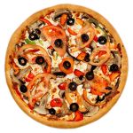 A garden-fresh mix of mushrooms, bell peppers, onions, black olives, and tomatoes atop a golden crust with melted mozzarella.